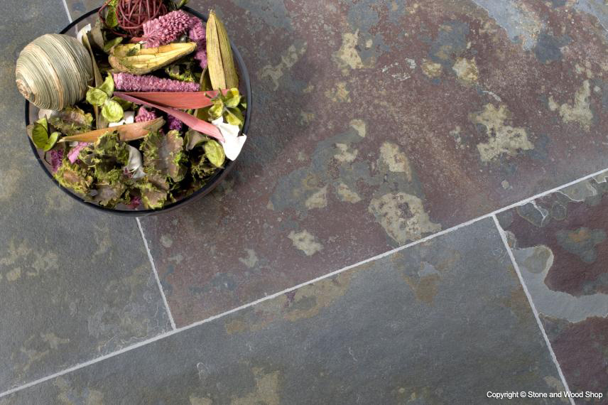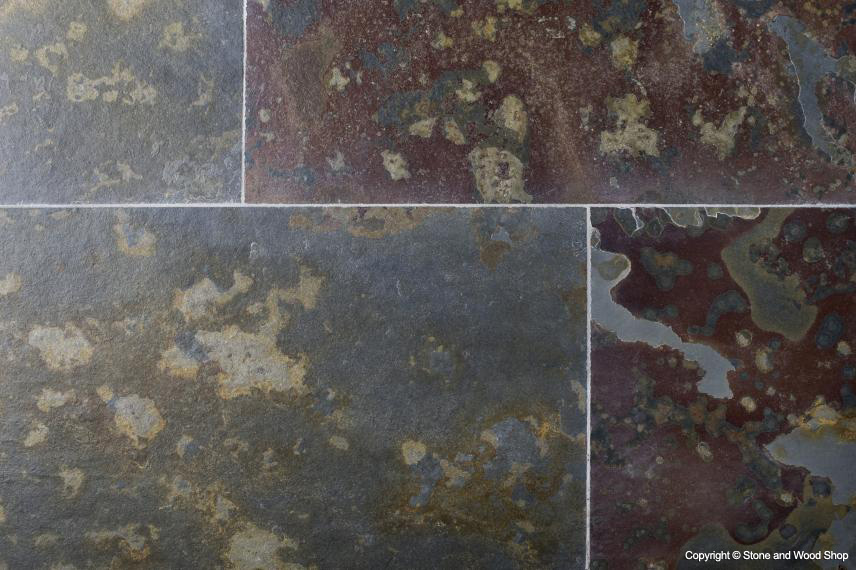 This vibrant, colourful slate floor tile has a blue-grey background overlaid with rusts, ochres, and splashes of burgundy. The texture is deceivingly smooth and very pleasing to the eye. Use anywhere in your home for instant impact.