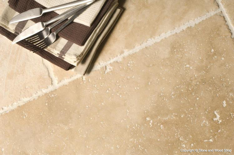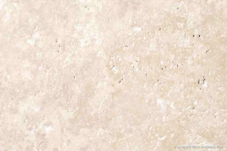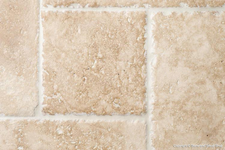 The surface of the stone is created using diamond-tipped brushes, which give it a dimpled texture. The brushes also mildly polish this Travertine floor tile, giving it a soft satin finish. The chipped edges finish the antique look nicely, with colours from light cream to dark beige.